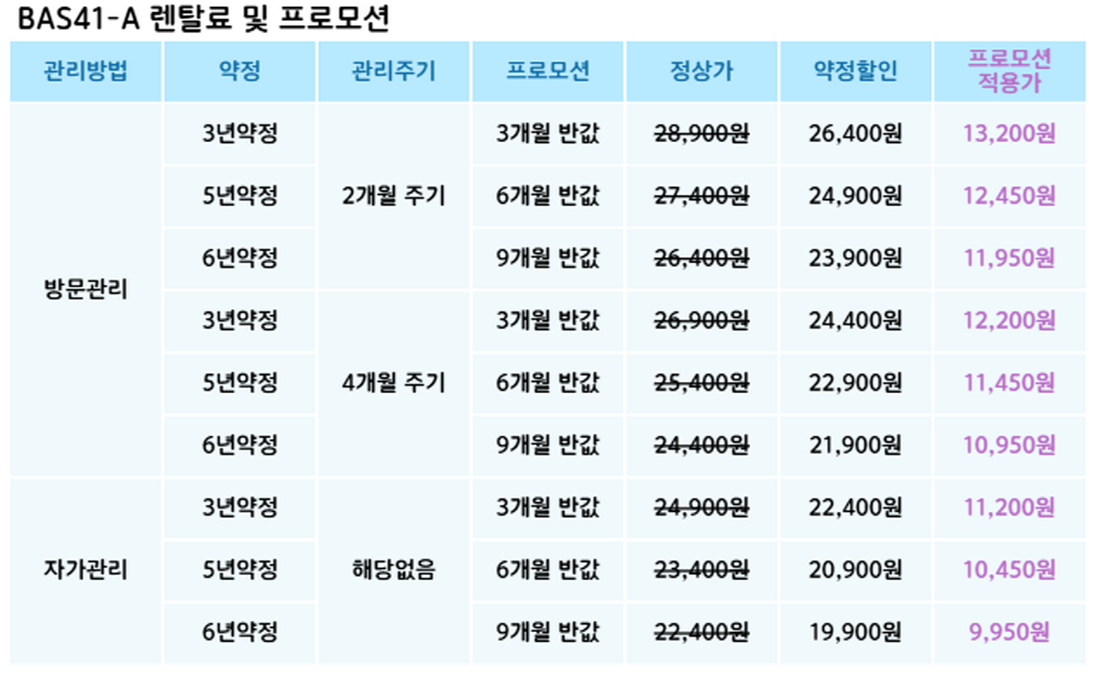 BAS41-A 코웨이 [코웨이] 스타일케어 비데 제품분류 비데 AS기간 렌탈기간내 최저 렌탈가 월 19,900 (렌탈가) 제휴카드 할인가 월 (렌탈가) 3년 5년 6년 자가관리 방문관리/4개월 제품색상 선택 핑크 + 0원 그린 + 0원 그레이 + 0원 할인 제휴카드 보기 렌탈신청 장바구니